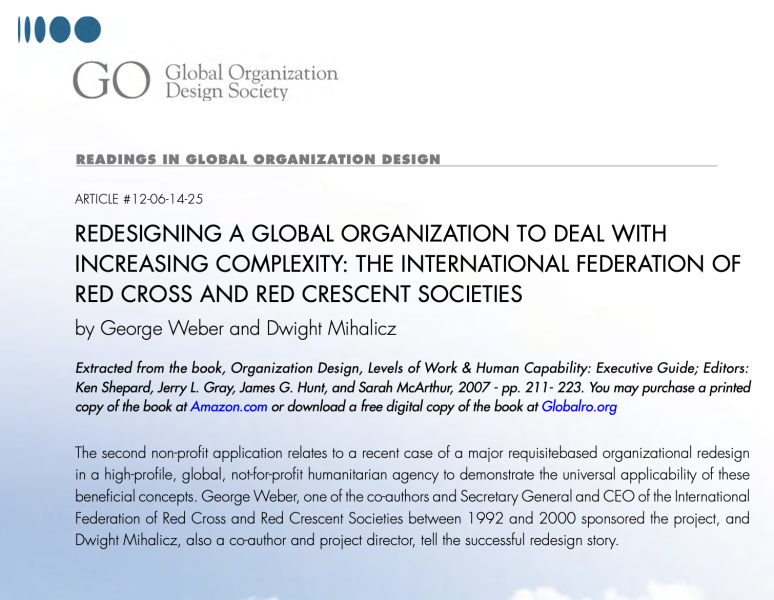 The second non-profit application relates to a recent case of a major requisitebased organizational redesign in a high-profile, global, not-for-profit humanitarian agency to demonstrate the universal applicability of these beneficial concepts. George Weber, one of the co-authors and Secretary General and CEO of the International Federation of Red Cross and Red Crescent Societies between 1992 and 2000 sponsored the project, and Dwight Mihalicz, also a co-author and project director, tell the successful redesign story.